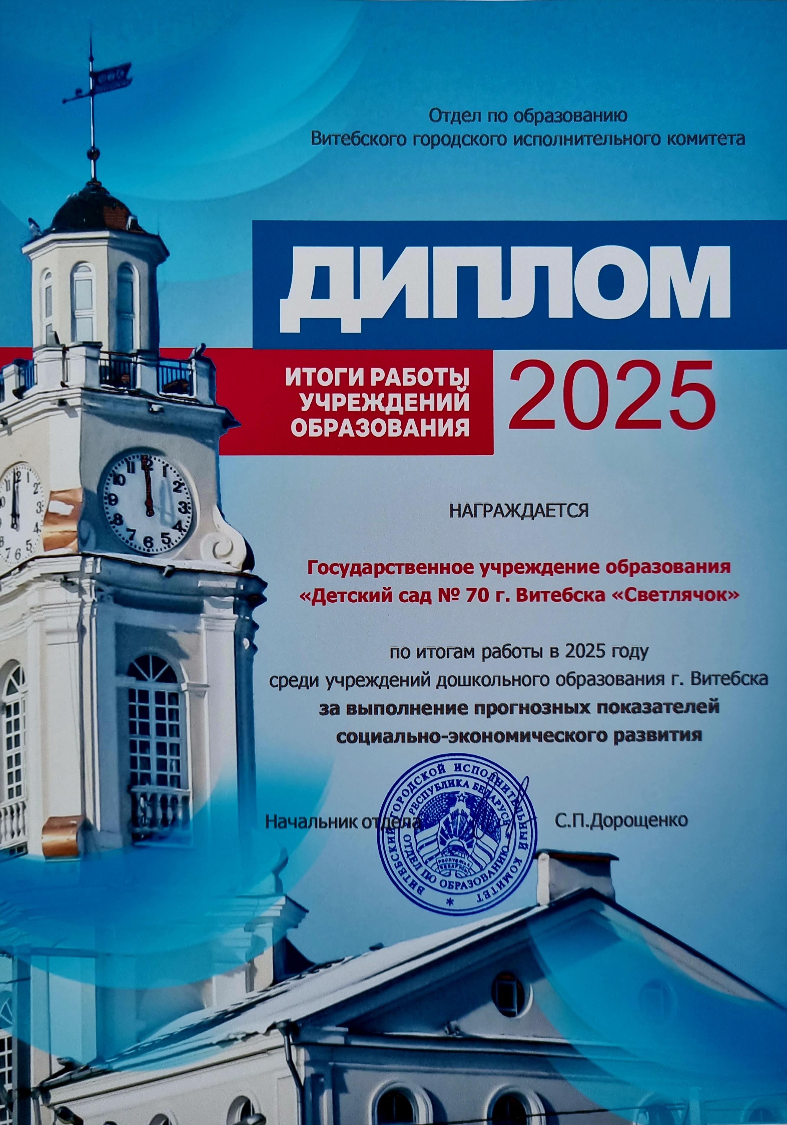 24.02.2026УЧРЕЖДЕНИЕ ДОШКОЛЬНОГО ОБРАЗОВАНИЯ НАГРАЖДЕНО ДИПЛОМОМ ВИТЕБСКОГО ГОРОДСКОГО ИСПОЛНИТЕЛЬНОГО КОМИТЕТА ПО ИТОГАМ РАБОТЫ ЗА 2025 ГОД ЗА ВЫПОЛНЕНИЕ ПРОГНОЗНЫХ ПОКАЗАТЕЛЕЙ СОЦИАЛЬНО-ЭКОНОМИЧЕСКОГО РАЗВИТИЯ